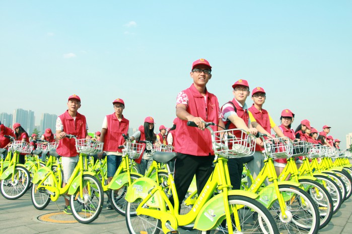 为配合做好章丘市公共自行车系统启动工作, 7月2日早晨7点,由我院31名大学生组成的志愿者服务队,在团委副书记史雪老师的带领下参加了此次活动,并全程参与公共自行车志愿者服务工作。