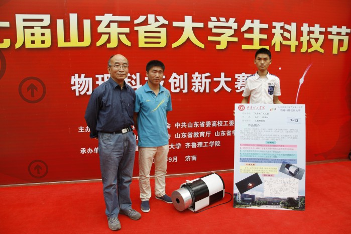 在山东省第七届大学生科技节物理科技创新大赛中,来自机电工程学院通信工程专业的2013级学生马力、张宝和组成的小组在李红老师、王蕴珊教授的指导下设计制作了《新型霍尔元件物理特性实验装置》、《低音炮灭火器实验装置的制作》两件作品,分别获得了大赛的一等奖和二等奖,成果喜人。