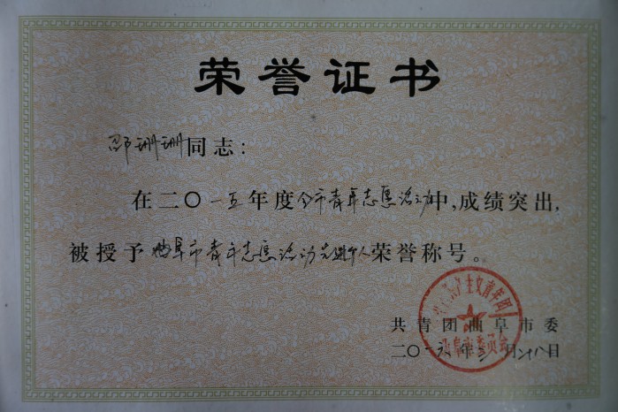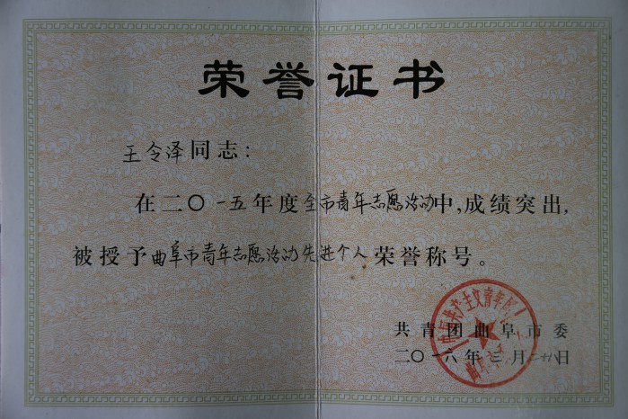 近日,曲阜市对2015年度全市共青团青年志愿者活动先进集体和先进个人进行了表彰。问鼎网页版登录入口曲阜校区志愿者协会获“青年志愿活动先进集体”荣誉称号;2013级书法专业王鹏、王令泽同学和2013级艺术设计专业邵珊珊同学获“曲阜市青年志愿活动先进个人” 荣誉称号。