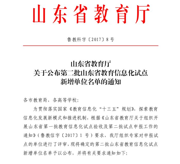 为贯彻落实国家《教育信息化“十三五”规划》,积极探索教育信息化发展模式和推进机制,山东省教育厅近日公布了我省第二批教育信息化试点单位名单,我校成为试点本科院校之一,学校教育信息化建设迎来新的发展机遇。