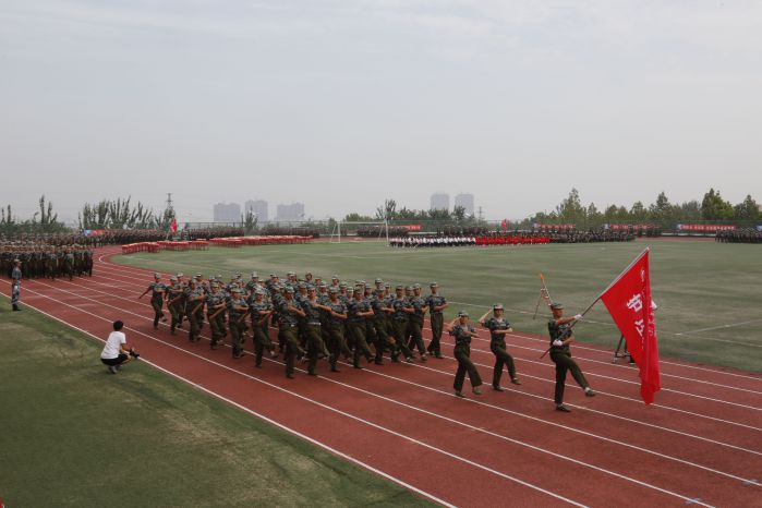 伴随着庄严的国歌,鲜艳的五星红旗冉冉升起,大会正式开始。激动人心的分列式表演随即拉开大幕。各个方队和着激昂的乐曲先后从主席台前经过,他们步调一致、队伍整齐划一、口号嘹亮,以昂扬的斗志和雄壮的气势向与会领导和老师展示了军政训练的优秀成果以及当代大学生昂扬勃发的精神面貌,赢得了现场阵阵掌声。