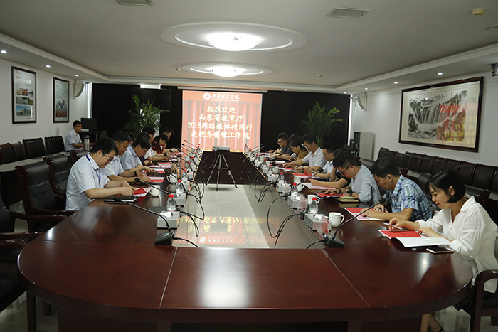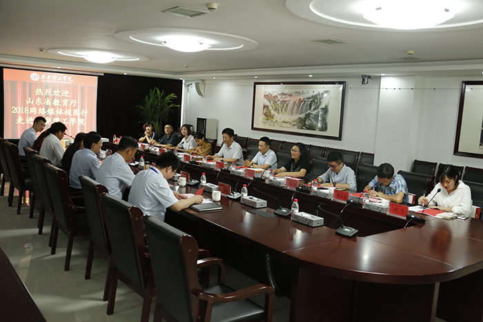 2018年6月26日下午,山东省教育厅新闻中心主任宋全政带领人民网、新华网、中国网等8家网络媒体的记者来到我校,进行工作指导及采访交流。校长常翠鸣,副校长张庚灵,副校长、总督学魏希启,副校长单成娟,网络信息中心主任肖滋健,宣传部部长乔石参加座谈会。座谈会由副校长张庚灵主持。