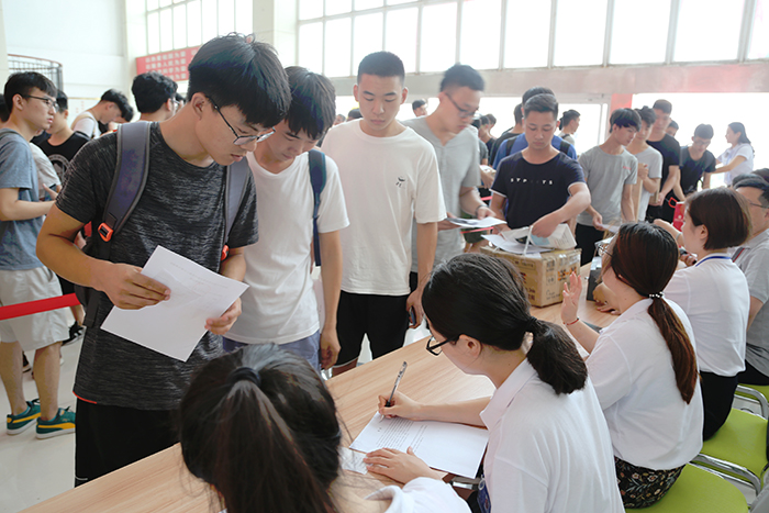 报到现场工作人员和志愿者的身影随处可见,现场报到审核有序进行