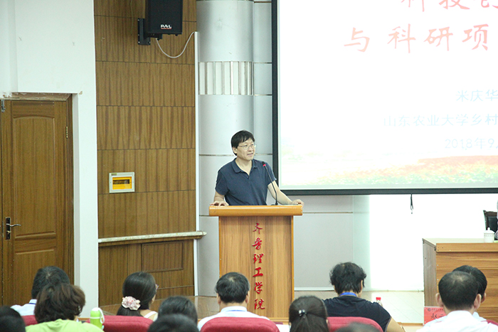 9月1日上午,学校邀请山东农业大学米庆华教授在实验楼报告厅做了关于“科技创新与科研项目申报”的专题报告,校长常翠鸣出席会议;校领导,学校科级以上干部,专业、教研室、实验教学中心、创新平台、研究所、教研科研项目、精品课程等负责人,骨干教师参加报告会。报告会由副校长张庚灵主持。
