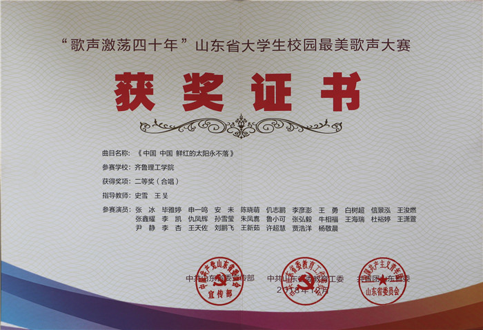我校团委自2018年4月接到活动通知以来,积极筹备,号召各二级学院认真推选合唱团队人选。经过层层选拔,包括张冰、毕雅婷、申一鸣在内的三十名队员代表学校参加本次比赛。在史雪老师、王旻老师的认真指导下,在三十名队员的不懈努力下,合唱团以一首《中国 中国 鲜红的太阳永不落》夺得了二等奖的好成绩。本次比赛历时八个多月,辗转十七个城市,近两万名选手参与,经过分赛区选拔赛、百强晋级赛、省级决赛等阶段,通过嘹亮、优美的歌声展现了新时代广大山东省高校青年学生昂扬奋进的精神面貌。