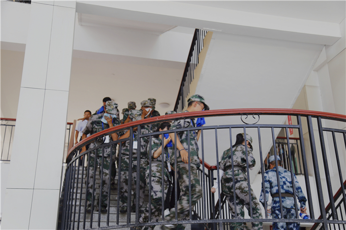 随着警报声的响起,演练正式开始,各班辅导员及承训教官协助学生队伍快速、有序地撤离。在辅导员及教官的正确指导下,学生们都能按要求弯着腰,用手绢、纸巾或手捂住鼻子,跟着队伍迅速撤离到教学楼外集结场地。整个过程中,师生们行动快速,配合默契,现场井然有序。