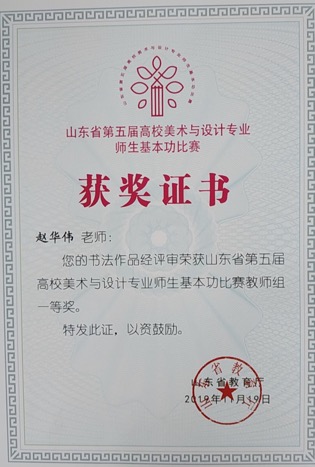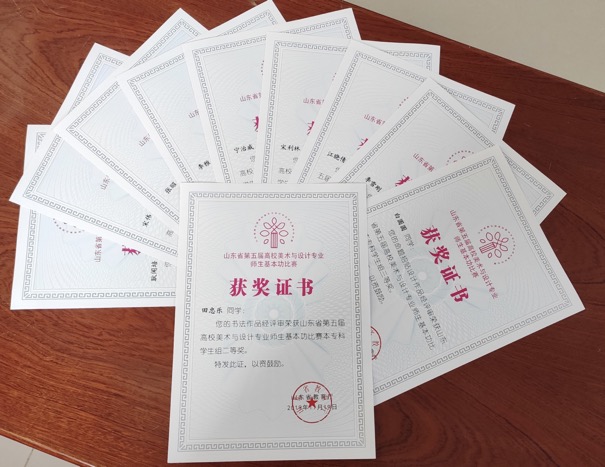 9月21日至23日,山东省第五届高校美术与设计专业师生基本功比赛在山东工艺美术学院举行。来自全省95所高校的1237名师生参加了本次比赛。近日,山东省教育厅公布了山东省第五届高校美术与设计专业师生基本功比赛评选结果,我校艺术学院教师赵华伟老师获书法教师组一等奖、张剑老师获书法教师组三等奖;书法学专业田忠乐同学获书法学生组二等奖;宋利林、耿闻培、宋伟、宁治威、李雅分获书法学生组三等奖,张昭获篆刻学生组三等奖;视觉传达设计专业白圆圆、李雪刚、江晓倩分获设计类三等奖。