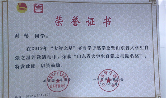 近日,由团省委、省学联、大智教育集团联合开展的2019年“大智之星”齐鲁学子奖学金评选结果揭晓,我校教育学院刘畅同学荣获“山东省大学生自强之星提名奖”。