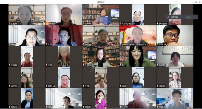 4月14日,曲阜校区文学院基础外语教研室与济南校区基础部大学英语教研室相聚云端,合力召开2022届本科毕业论文线上指导工作专题研讨会。文学院院长秦国华、基础部主任蔡秀国、实验中心主任孙彩虹、各教研室主任和全体指导教师参会,会议由基础外语教研室主任李华主持。