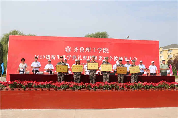 军政训练歌咏比赛、趣味运动会的获奖单位代表上台领奖