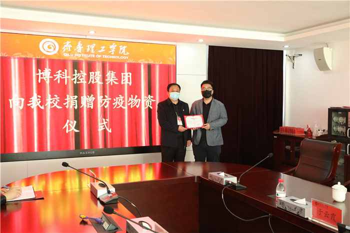 4月23日,博科控股集团向学校捐赠了一万只一次性口罩,助力学校做好复学准备。副校长陈月吉、校长助理韩衍顺以及校办、学团工作部、宣传部、机电工程学院负责人参加捐赠仪式。