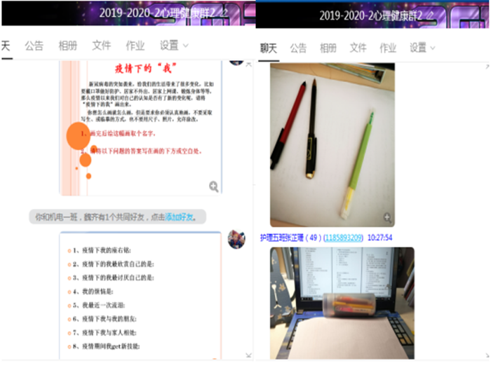 学校历来重视大学生心理健康教育工作,尤其在疫情期间,贴近学生需求,认真部署,广泛动员,精心组织,教学与学生管理双管齐下,多方开展线上线下相结合的心理健康教育。在教学过程中,教师根据课堂内容与当前的情况,与绘画相结合,通过分享的形式,让学生了解疫情期可以以不同的方式度过,帮助学生树立良好的习惯以更好的心态面对未来。在学生管理工作中,辅导员加强与学生的沟通,通过谈心谈话的形式,了解掌握学生的心理状况;对于个别表现异常的学生,深入了解与分析,确定辅导思路与方法,帮助学生逐步树立良好的行为习惯与心态。在日常的心理健康教育中,建立学校、学院两个层次的心理健康教育工作台账;充分发挥“学校—学院—班级—宿舍”心理健康教育四级网络基层力量的作用,每周收集并整理《心理信息反馈表》,及时了解学生心理动态信息,掌握倾向性、苗头性问题,有效呵护了广大青年学子的心灵。