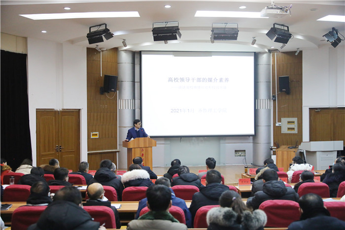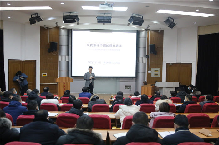 1月8日,山东省教育厅新闻中心主任、二级调研员宋全政应邀来我校举行“高校领导干部的媒介素养——谈谈高校舆情应对与校园传播”专题讲座。校长常翠鸣为宋全政颁发“特聘教授”聘书。