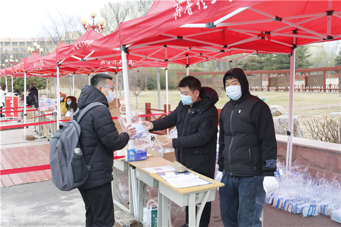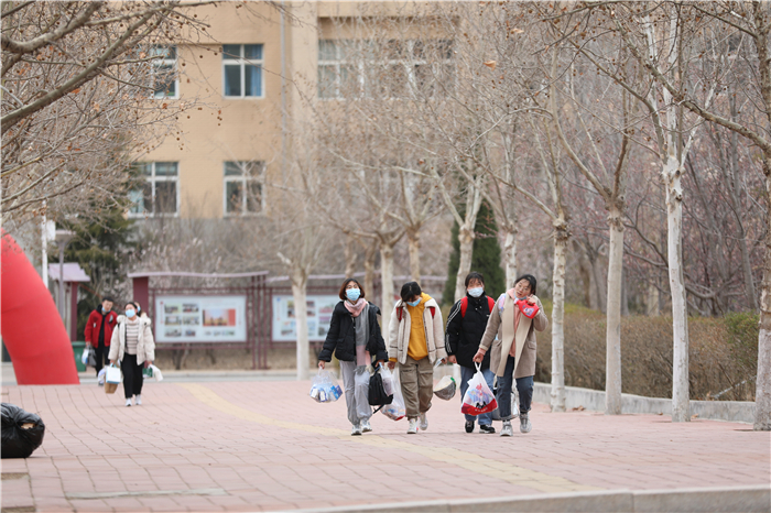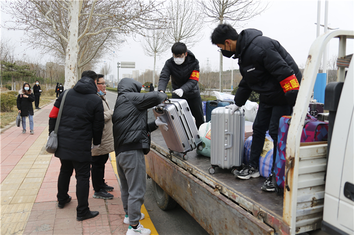 学校为同学们平安返校做了充分准备和悉心安排。在校门口,学校专门安排了车辆帮助返校学生托运行李,一身轻松的同学们有序排队,依次出示健康码、扫描核验身份、消毒、测温、领取并更换口罩后进入校园,整个返校过程秩序井然。在报到现场,各二级学院的院长、老师们一边迎接自己的学生,一边为大家发放“爱心健康包”。宿舍楼前,老师和志愿者帮着学生把行李一件件搬到宿舍,尽管天气寒冷,但是看到学生们能够平安回来,还是觉得所有的付出都是值得的。