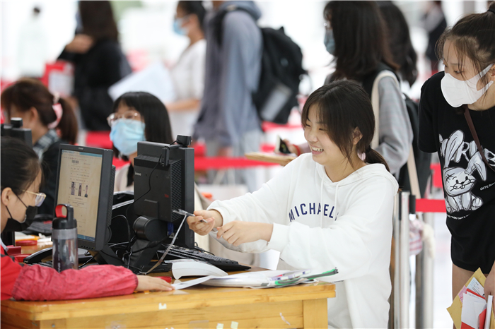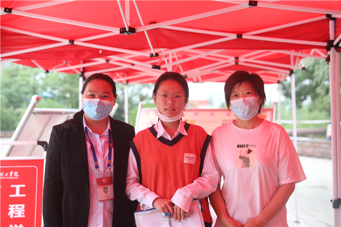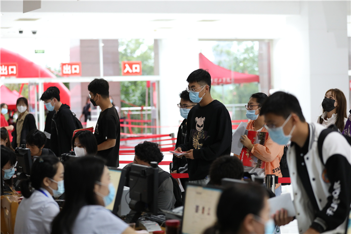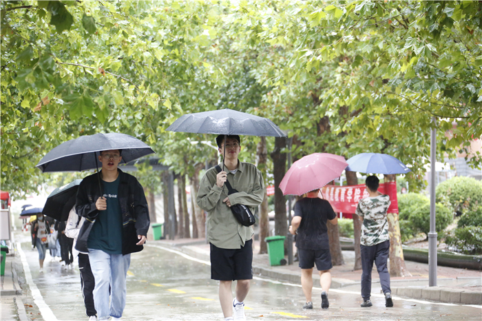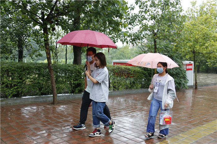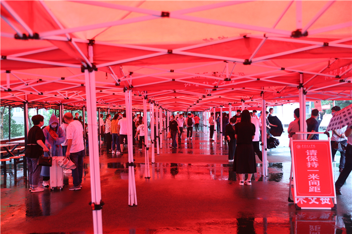 下个不停的秋雨给迎新工作带来很多困难,但所有工作人员坚守岗位、热情依旧。在学校大门口,工作人员身着雨衣、穿着雨靴指挥交通、查验健康码;在学生排队等候区,志愿者手持扩音器,不停地引导新生有序分组排队,嗓子都喊哑了;在入学注册审核现场,工作人员细心询问新生的个人信息,办理入学手续;在二级学院报到点,各学院院长和老师们在冷冷的雨中耐心地向家长和学生解疑答惑。等到下午,雨突然大起来,迎新指挥部再次启动紧急预案,把二级学院报到点由室外转移到室内。