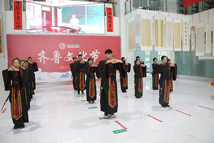 开幕仪式上,与会领导共同启动卷轴,宣布2021年齐鲁文化节正式启动。齐鲁文化社团联盟的学生们进行了精彩的古典文艺展演。
