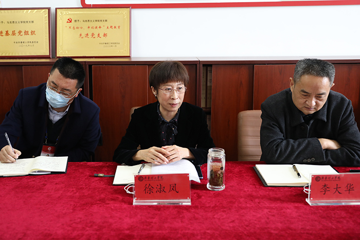 徐淑凤对马克思主义学院提出了三个方面的具体要求:一是要充分认识学校马克思主义学院的地位和作用,坚持“马院姓马,在马言马”的鲜明导向和办学原则,为巩固马克思主义在意识形态领域的指导地位,推动马克思主义进校园、进课堂、进学生头脑发挥应有作用。二是马克思主义学院下一步的建设,要坚持鲜明导向,坚持党建引领,坚持开放办院,坚持改革创新,坚持养德修为。三是马克思主义学院在学习宣传贯彻党的二十大精神中,要切实认清重大意义,掀起学习热潮,在“三进”中走在前、作表率。