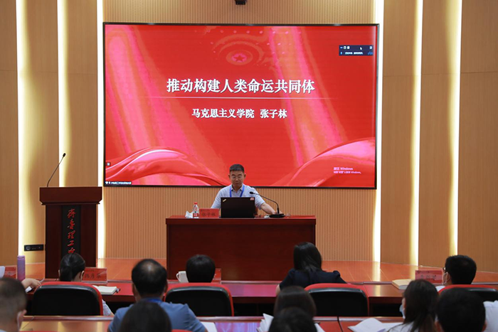 读书班集中领学了习近平在中共中央政治局第五次集体学习时的重要讲话,邀请了马克思主义学院张子林教授作了专题辅导报告。报告中,张子林以“推动构建人类命运共同体”为主题,按照“世界怎么了”“人类向何处去”“中国怎么办”的思维逻辑,分别从人类命运共同体思想提出的时代背景、主要内涵和路径及其实践等方面进行了阐述。辅导报告立意深远、内涵丰富、脉络清晰、重点突出,通过深入浅出的语言,生动翔实的案例,多维度深层次地让大家深刻理解了推动构建人类命运共同体的思想内涵。