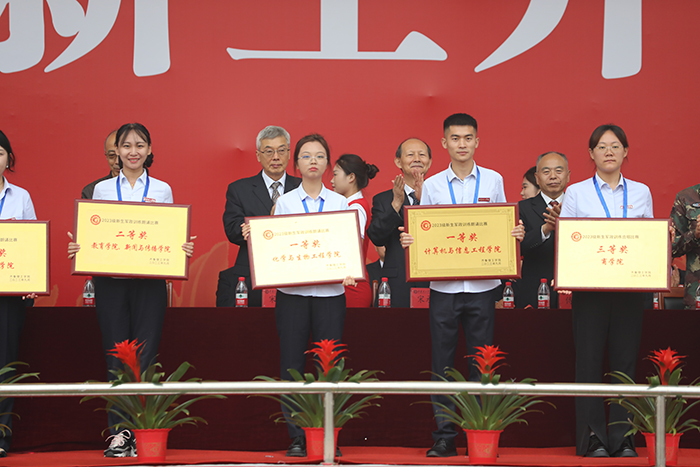 开学典礼上,学校对军政训练获奖单位和个人进行了表彰;同时表彰了2023年度优秀教学团队和优秀教师、“最美教师”、教学比赛获奖教师。