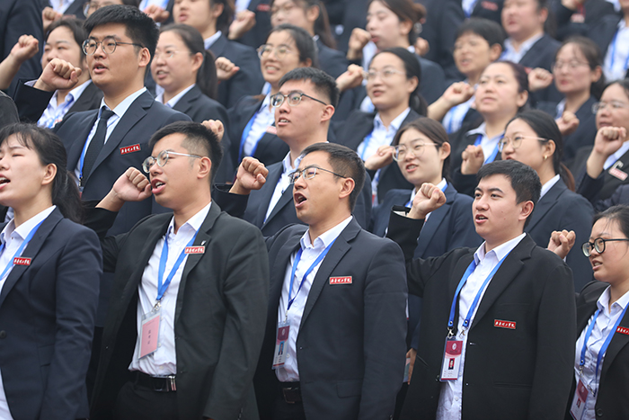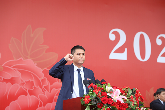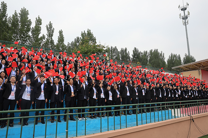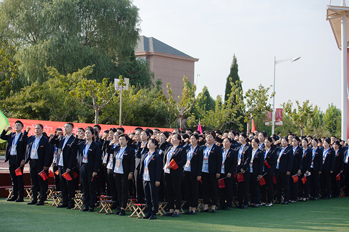 在鲜艳的五星红旗下,全体教师和2023级新生举起右手庄严宣誓。老师们立志牢记为党育人、为国育才的初心使命,树立“躬耕教坛、强国有我”的志向和抱负;2023级新生们,用铮铮之声表达“请党放心,强国有我”的决心。