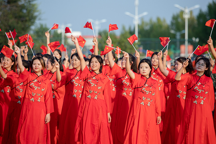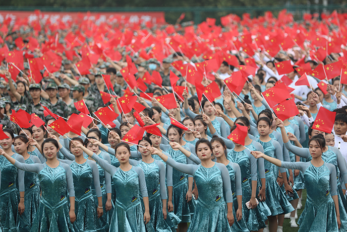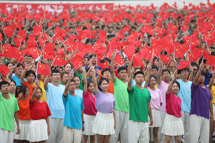 典礼最后,全场起立,万名师生挥舞手中的国旗,共同唱响《我和我的祖国》,表达对伟大祖国繁荣昌盛的美好祝愿,为2023级开学典礼画上圆满句号。
