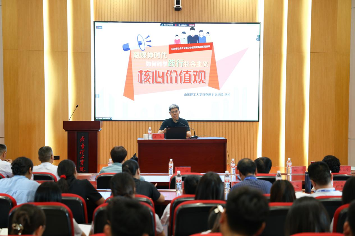 5月24日,山东省培育和践行社会主义核心价值观宣讲活动走进我校,山东理工大学马克思主义学院教授岳松以“融媒体时代如何科学践行社会主义核心价值观”为题,为师生们带来了一场精彩生动、激情洋溢的特殊思政课。党委书记徐淑凤,相关校领导,有关职能部门负责人,师生代表共500余人参加活动。宣讲会由党委副书记李大华主持。
