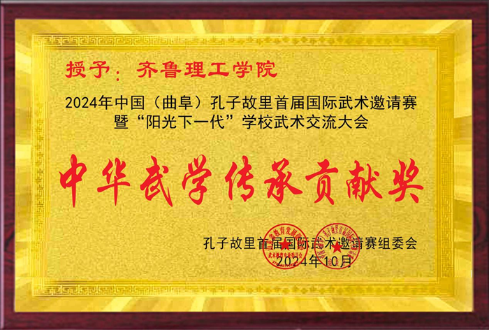 近日,2024年中国(曲阜)孔子故里首届国际武术邀请赛暨“阳光下一代”学校武术交流大会在曲阜市孔子国际会展中心顺利举办。副校长韩衍顺代表学校参会并在开幕式致辞,我校被大赛组委会授予“中华武学传承贡献奖”。