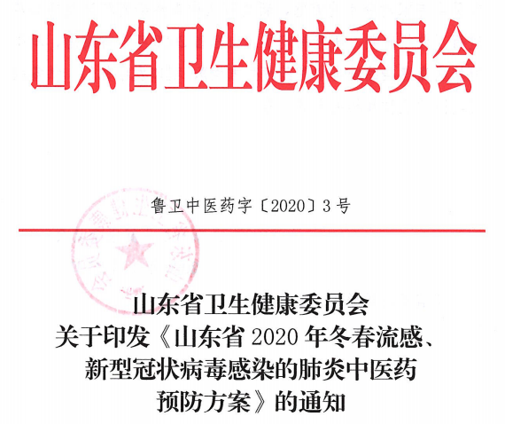 [上级精神] 关于印发《山东省2020年冬春流感、新型冠状病毒感染的肺炎中医药预防方案》的通知 日期:2020-01-29 09:00:21