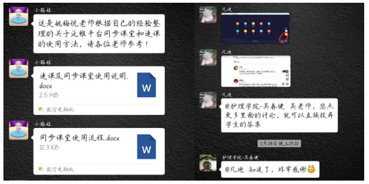 一、积极研讨,共克时艰 最近护理学院教师群可热闹了,老师们一边摸索直播攻略、慕课资源等,一边又向学院里精通网络操作的老师请教。好在每当老教师们把一个问题抛出,就会有青年教师出面帮忙解决。一些具有丰富线下线上混合式教学经验的优秀青年教师,积极对接平台运营商技术人员,调研学习同行教学经验,并将总结整理好的电子版分享给各授课教师。就这样,大家就都摸清了线上授课的思路脉络。 ![]()