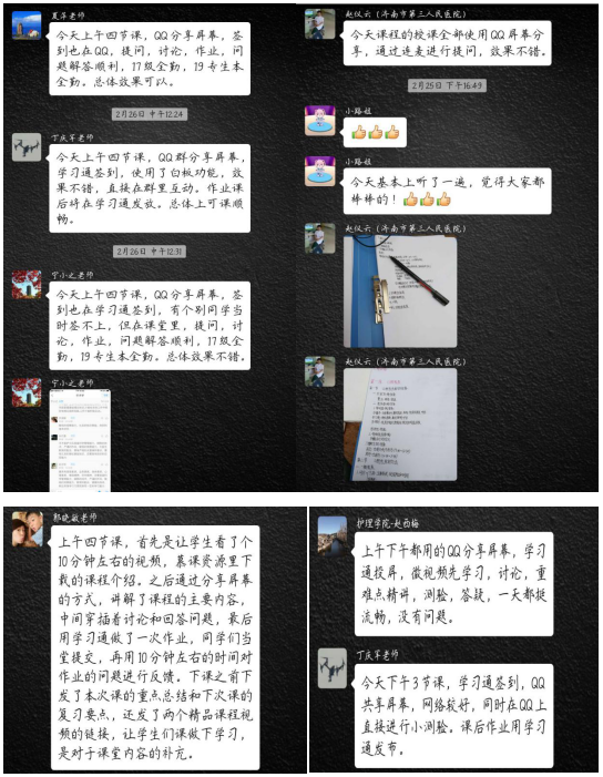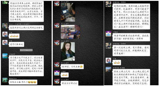 考虑到学校有些老教师没用过钉钉、腾讯课堂等直播平台,尤其对于一些年纪偏大、教育技术掌握偏弱的教师,学院也安排了年轻教师担任助教。“课前试运行”也必不可少,试课一开始简直是手忙脚乱,不过,学生们都是报以理解。经过课前试运行,到2月24日正式“网上开学”,在新老教师互帮互助的情况下,老师们基本确定了“直播授课+在线互动”“录播资料+翻转课堂”等模式,并实时分享线上授课情况,共同提高线上教学技术。 ![]()