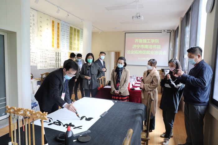 更新时间:2022-04-29 15:42 4月29日,学校副校长李照带领艺术学院院长张胜利、就业副院长李庆书、行政科长沙京星、书法理论教研室主任李逸群一行赴济宁南池书院开展线下合作交流。济宁南池书院院长魏琳琳热情接待了我校来访团。