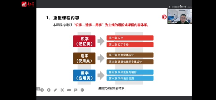 分享会上,李锋老师以《字体设计》线下一流课程建设思路与实践探索入手,从字体设计课程概述、课程建设思路与实践探索、教学改革成效三个方面展开介绍,详细介绍了课程团队情况、课程建设历程、以及课程目标等内容,从重塑课程内容、巧融德育元素、引入真实项目和构建课程全过程评价体系四个方面阐述了《字体设计》课程建设路径,同时从专家评价、学生评价、教研成果、学生参赛和课程推广五个方面详细介绍了我校教学改革成效。