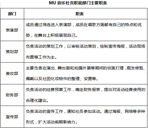 MU音乐社设有指导老师和社长各一名,副社长两名,下设表演部、策划部、财务部、宣传部四个职能部,现有社员一百四十余人。自创办以来,开展了“冬季之韵”“夏季之韵”“室外live”“室内live house”等活动。让同学们通过听歌唱歌的方式,提高自身能力,丰富校园文化生活。